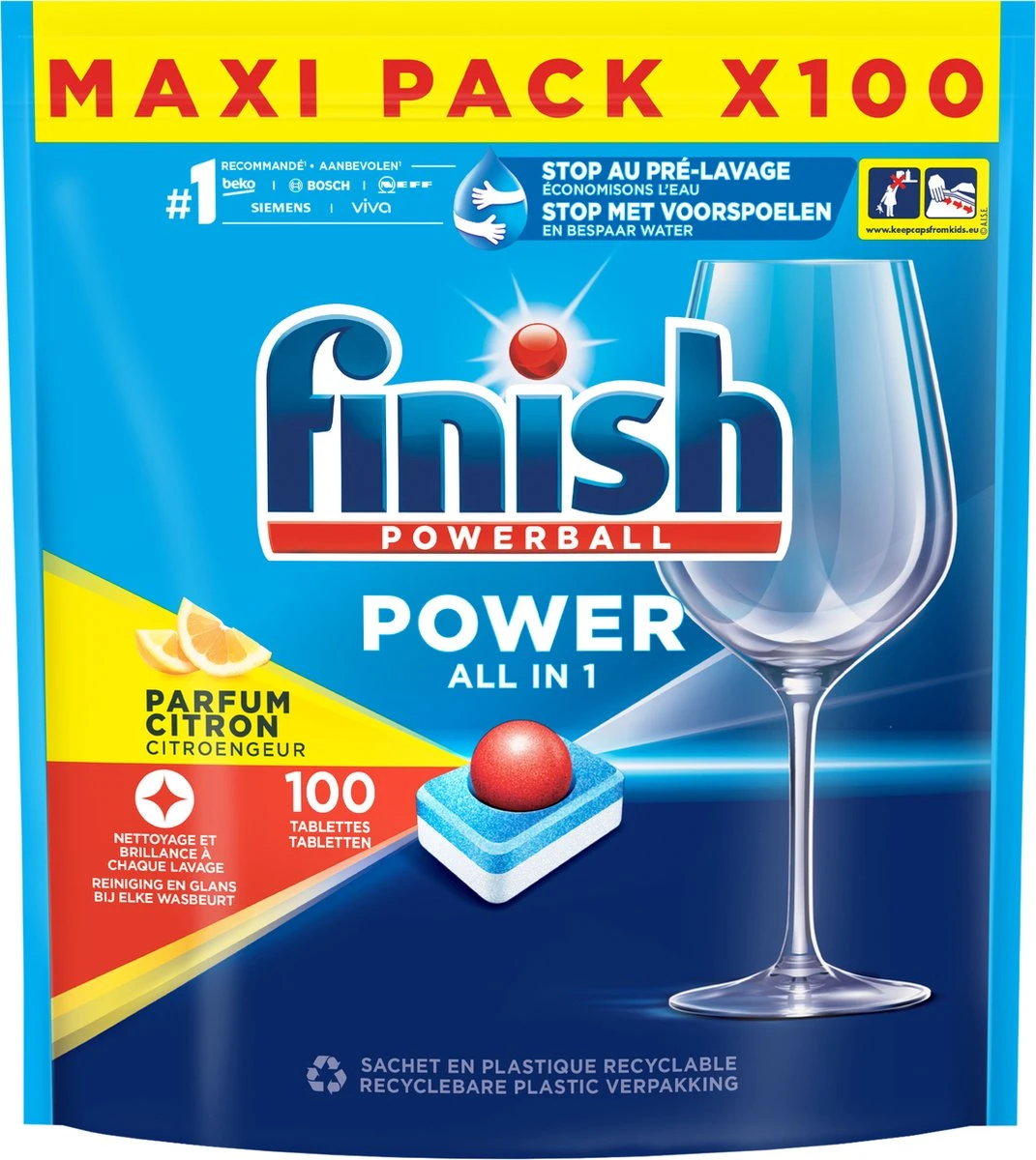 Deze verpakking bevat 100 Finish Power all in one citroen vaatwastabletten.
