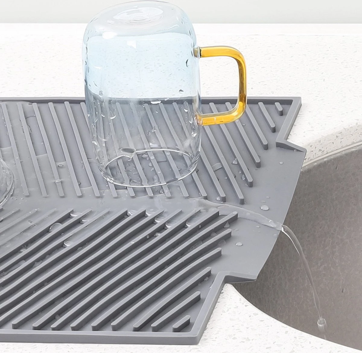 - Met een eenvoudig afvoersysteem kan al het overtollige water weglopen in de gootsteen. Voorkomt ophoping van water op de mat en verkleint het risico van stilstaand water op je aanrecht.