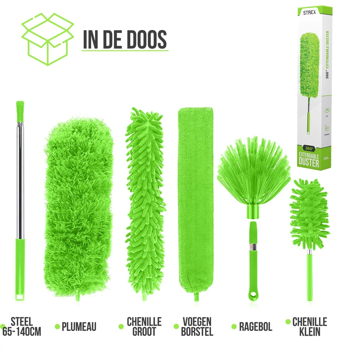 Ook zo klaar met hoge spinnenwebben en stof? Met de 5-delige Strex telescopische plumeau set kom jij makkelijk bij het plafond. De microvezel kop neemt elektrostatisch stof, pollen en andere deeltjes op en vangt deze op als een magneet. Door het stevige maar lichtgewicht ontwerp wordt schoonmaken efficiënter dan ooit.